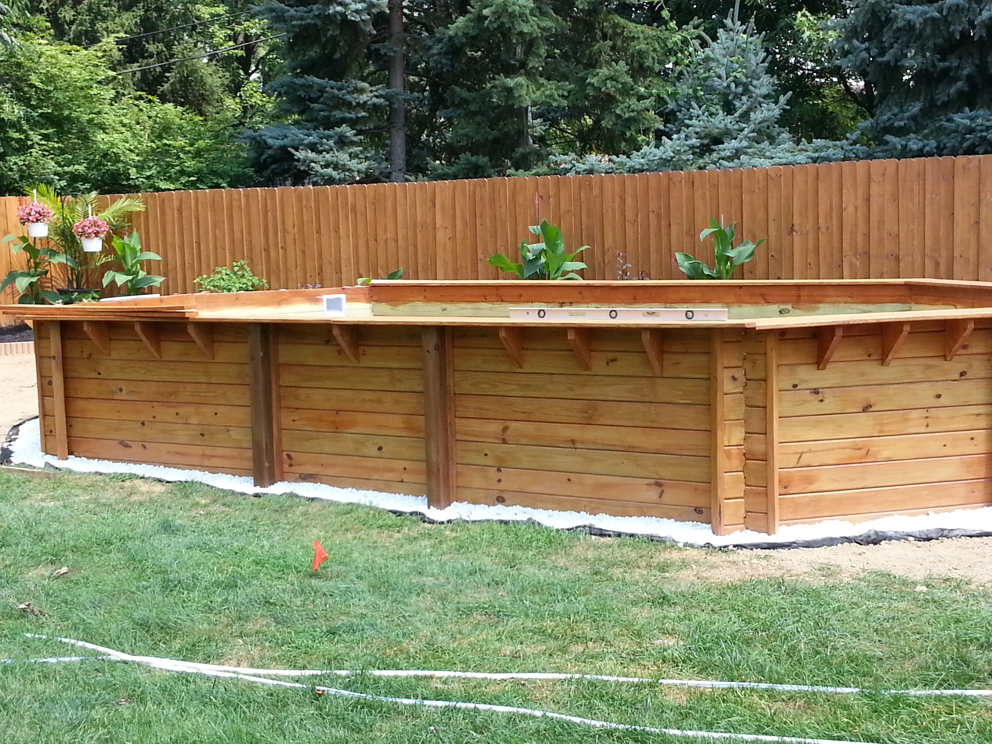 - A standard wooden, eleven inch top-rail cap shelf surrounds the pool.